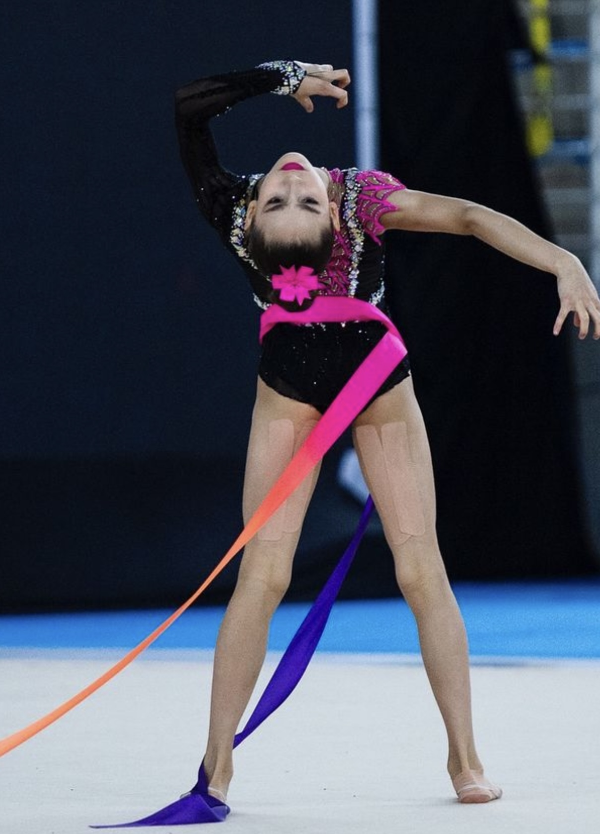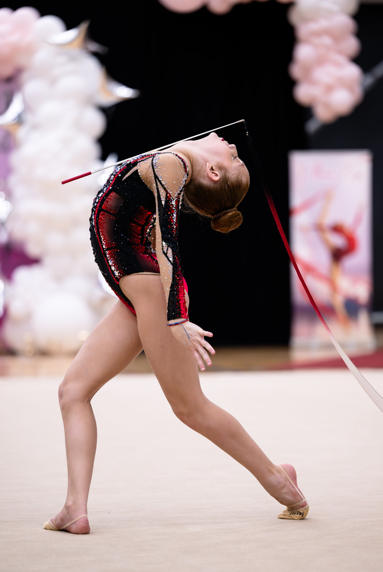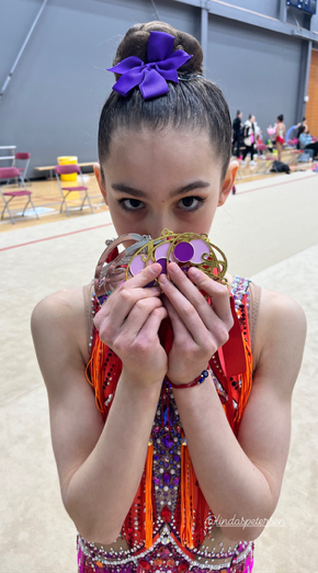 Linda’s routines dazzled with their artistic brilliance and technical precision. Her hoop routine, performed in a striking red leotard set to the timeless Romeo and Juliet soundtrack, was a highlight of the competition, reflecting both her grace and passion. Although her ribbon routine, accompanied by a unique Coraline movie soundtrack, narrowly missed the podium, it captivated audiences and showcased her exceptional apparatus technique.